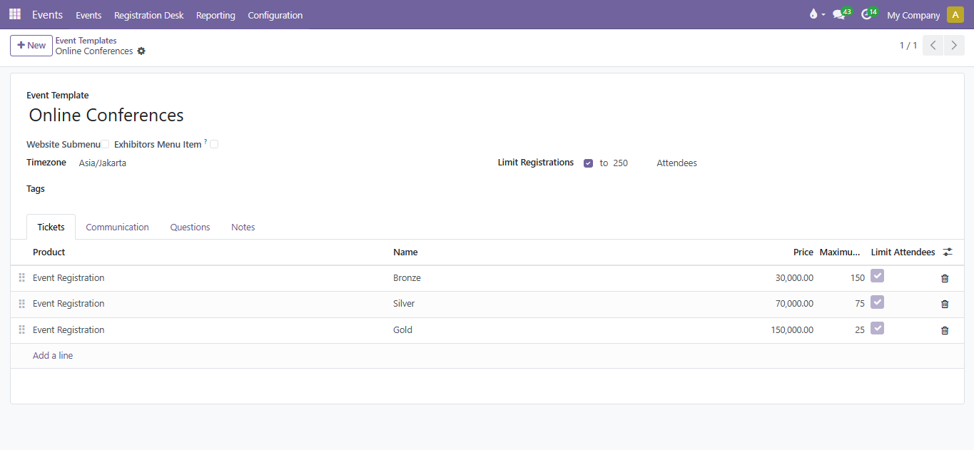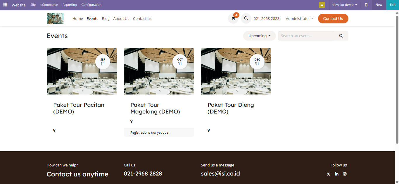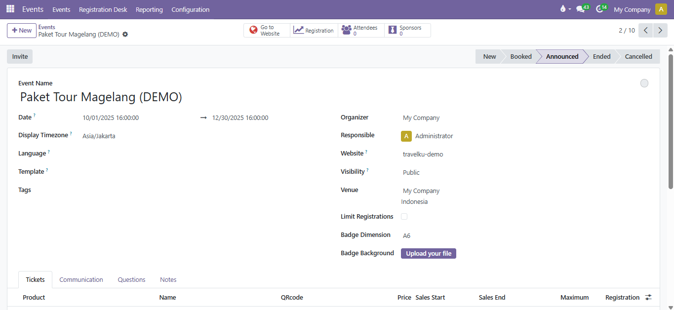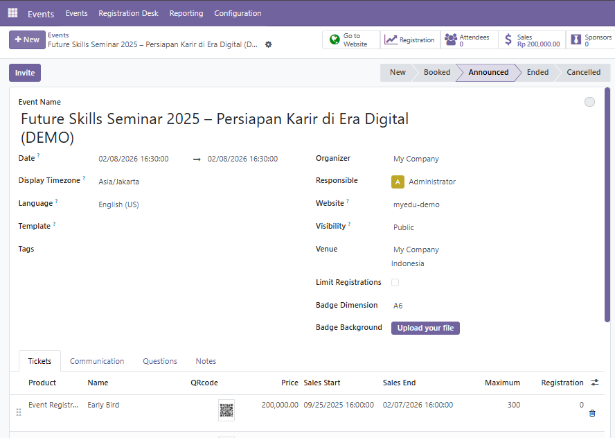 Odoo Events memungkinkan Anda merencanakan, mempublikasikan, menjual tiket,