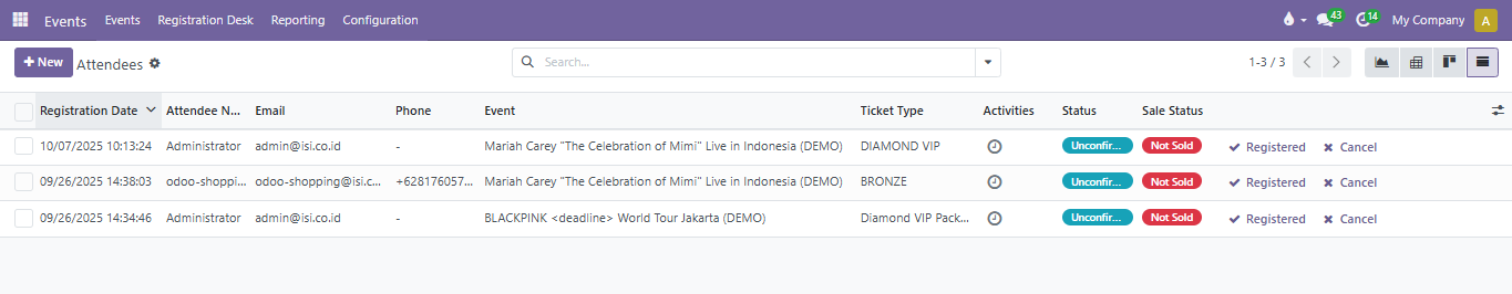 Filter berdasarkan Status (Registered/Attended/No‑show).
