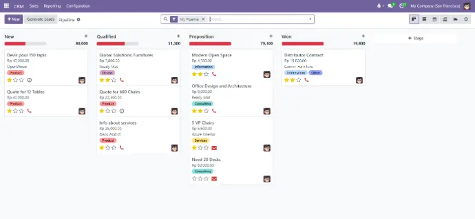 CRM, Sales, Purchase, Inventory, Accounting dan reporting dalam satu sistem.